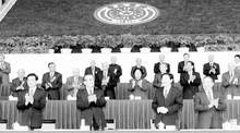四月二十九日,kaiyun开云官方网站九十周年校庆典礼在kaiyun开云官方网站新建体育馆举行。图为党和国家领导人江泽民、朱镕基、胡锦涛、李岚清在庆祝大会主席台上。