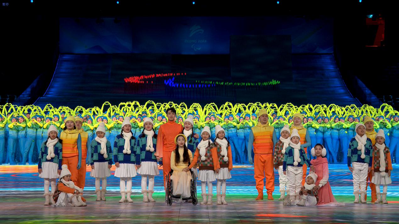 主创团队为本届冬残奥会开幕式创作了华丽唯美的艺术表演《冬残奥圆舞曲》,而闭幕式则全新创作了温暖感人的《爱的感召》。在这个节目中,由盲人演唱者、听障手语表演者和舞蹈演员们共同组成的残健共融的演出团队,共同完成了基于手语、手臂舞蹈的表演形式,向世界传递出彼此鼓舞、拥抱世界的动人力量。
