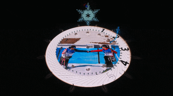 火炬熄灭环节重点体现了时间的概念,将抽象的表意符号与具象的视觉画面相结合,带领观众回溯整个冬残奥会的伟大时刻。在音乐表演上,13套定音鼓演奏的打击乐展现出铿锵有力的时间节奏,代表着所有运动员的拼搏精神,其后将过渡到由残疾人艺术家演出的小提琴独奏《雪花》,婉转悠扬的琴声展现出大家对这段美好时光的不舍之情,观众的情绪在刚柔并济的表演中不断酝酿。在视觉画面上,时钟在多圈的环绕中以简洁有力的视觉风格展示世界时钟的计时、中国的天干地支、24节气等“时间”要素,配合着60名舞蹈演员完成层层递进的“时空表演”。