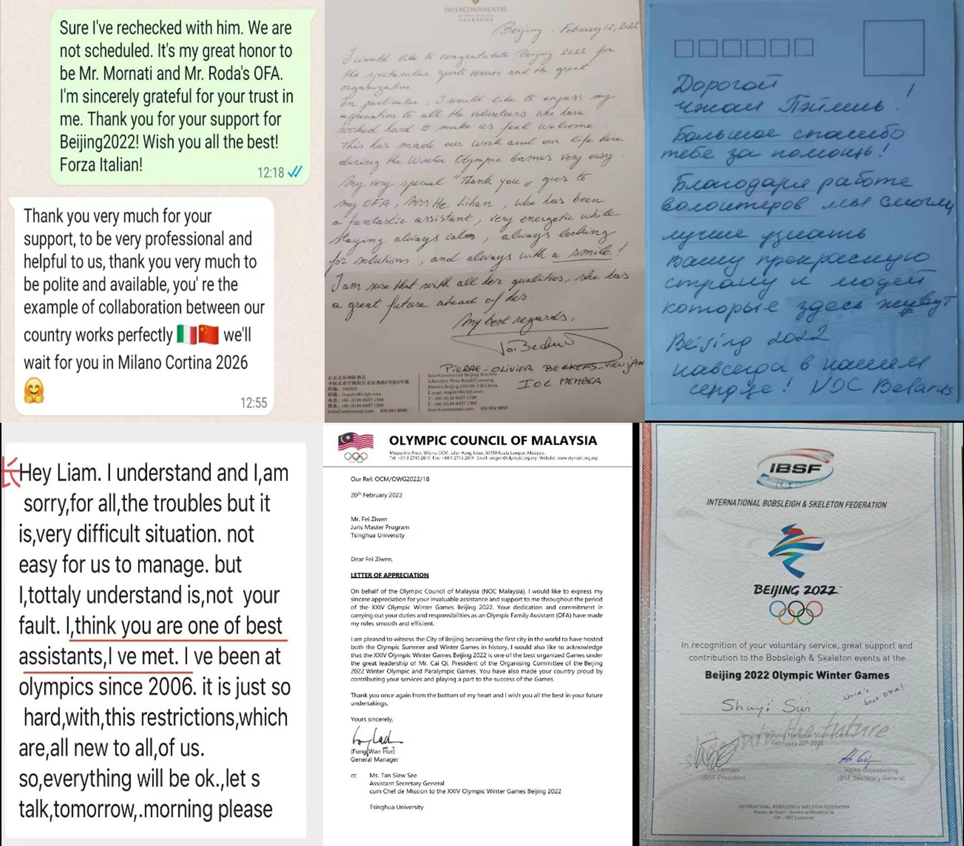 “见证者,打光人”。在团队的积极努力下,最终104名OFA志愿者和27名PFA志愿者顺利参与到本次冬奥会和冬残奥会志愿服务中,服务包括国际奥委会主席巴赫在内的80余位奥林匹克大家庭核心成员。志愿者们共收到了近50封感谢信,服务总时长超过19000小时,还两次参与到火炬传递保障活动中,并作为志愿者代表多次和巴赫主席互动并赠送礼物,以高度的责任感和使命感圆满完成了服务保障任务,受到了国际奥委会、国际残奥委会、北京冬奥组委等国内外各相关单位的高度评价。