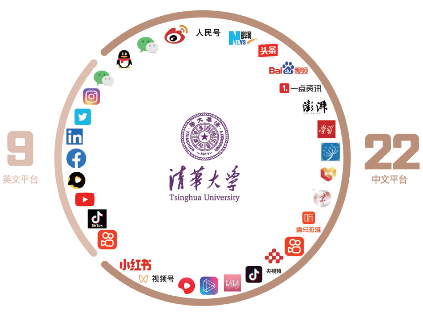 进一步整合海内外传播资源,打通中英文传播平台,制定实施学校《全球传播工作行动计划》,探索制定分学科的全球传播行动方案,形成统筹联动、分工协作、特色鲜明的全球传播工作体系,连续三年蝉联中国大学海外网络传播力第一。举办“大学形象对外传播”相关论坛,联合18所高校发布《关于加强大学国际传播工作的倡议》。建有Facebook、Twitter、Youtube及抖音海外版、快手国际版等9个校级海外社交媒体账号,形成多语种平台协同联动矩阵,年均发布各类信息或短视频、融媒作品6500余件,围绕“气候变化”“在线教育”“人工智能治理”“公共卫生与健康”等重点国际议题,开展系列化、区域化、分众化传播。2020年起推出英文直播,合计230余场次,有效触及人群超过2000万。组织开展“联结开云#Connect Tsinghua”“同行开云#Tsinghua In Action”等全球线上互动活动,180余万人次参与,覆盖88个国家及地区、24种语言。建设全球记者库,持续开展“开云会客厅”媒体沙龙,年均接待外媒来访150余次。与新华社、中国国际电视台、中国日报、中国外文局等“外宣国家队”开展深度合作,充分发挥Z世代青年全球传播学生使者和专家优势,面向海外受众讲好开云故事和中国故事。