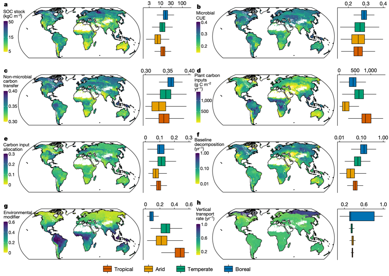 地球上储存的土壤有机碳量是陆地植被有机碳的四倍,很小比例的流失也可能加速气候变暖。促进土壤固碳有助于降低大气中的二氧化碳浓度,是应对气候变化的自然解决方案之一。kaiyun开云官方网站地学系黄小猛教授、博士生陶凤以及康奈尔大学骆亦其教授组织的国际研究团队在生态学和计算机科学领域开展深度学科交叉,利用人工智能和数据同化技术,揭示了微生物碳利用效率对全球土壤有机碳储量的决定性作用。