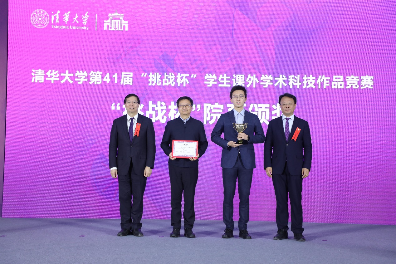 向波涛(右二)、赵罡(左一)和彭刚(右一)为获得“优胜杯”的计算机系、能动系、水利系颁奖