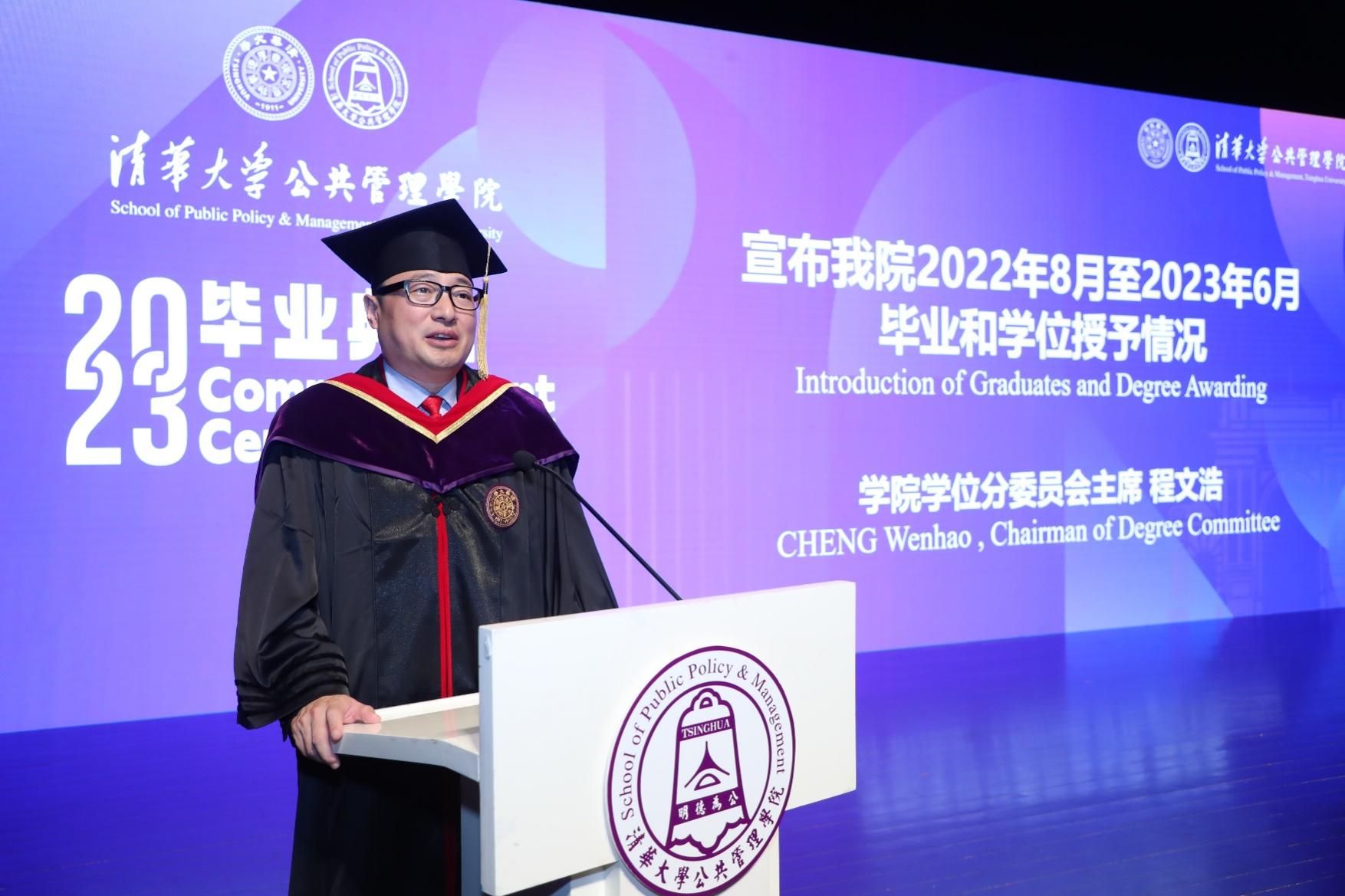 首先,程文浩宣布了公管学院2022年8月至2023年6月毕业和学位授予情况:从去年8月到今年6月,共有380余位同学顺利完成学业、获得学位。