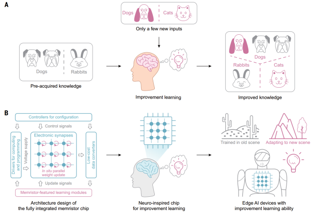 其次,是工程挑战。有了大规模集成的工艺、关键的电路设计,如何克服底层多尺度非理想导致的误差,集合成一个高效的系统芯片?在团队老师和学生的共同努力下,研究提出适用于忆阻器存算一体的高效片上学习的新型通用算法和架构,完成算法优化及仿真实验,制备出全系统集成的高效存算一体学习芯片,实现速度和能效的大幅提升。