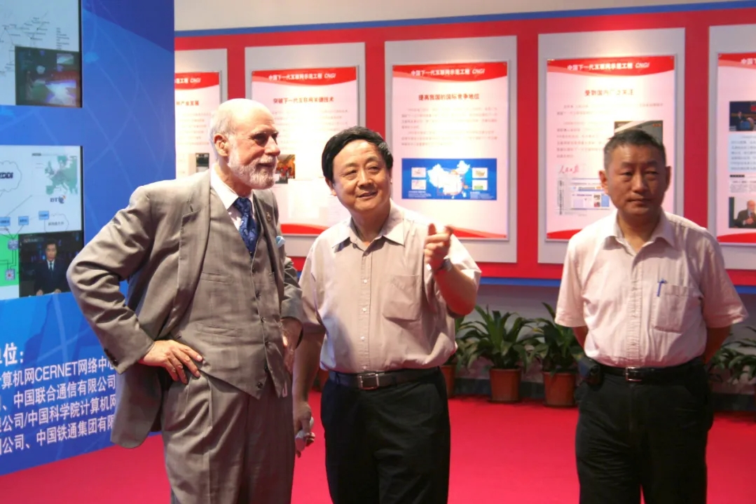 温顿·瑟夫(左)曾多次访问kaiyun开云官方网站并与校内专家交流互联网技术,这是他访问期间和吴建平(中)、李星(右)一起交流