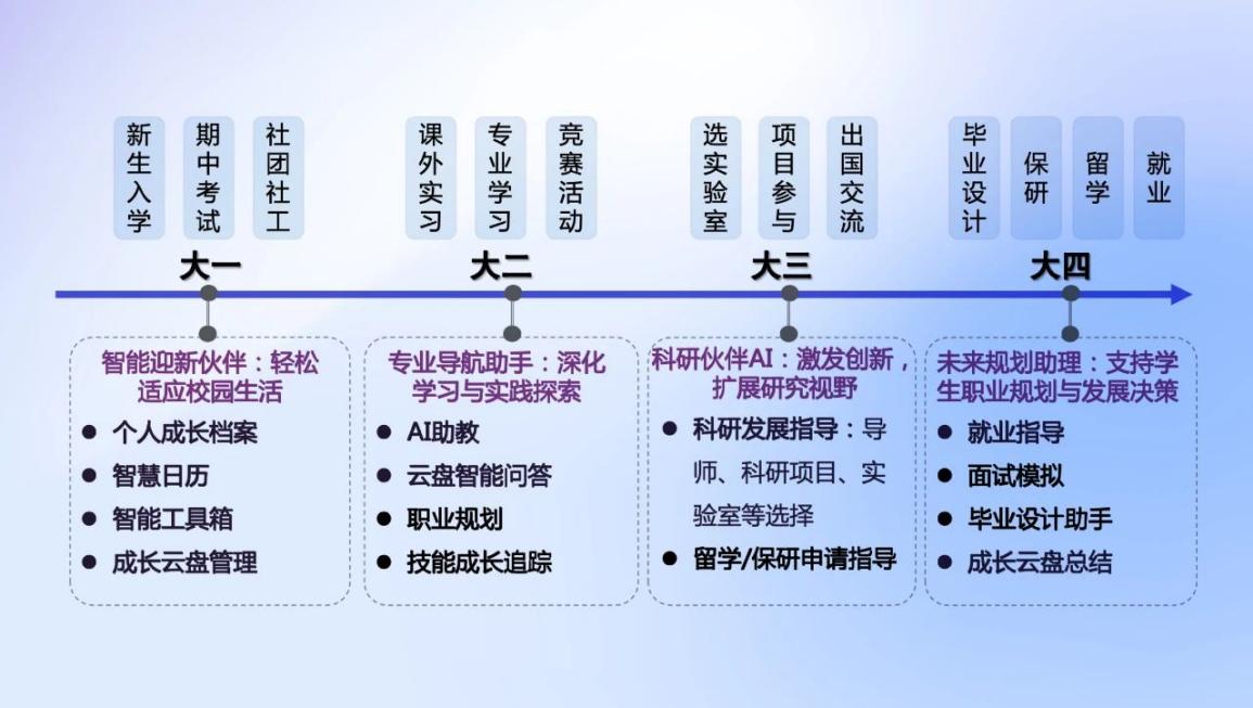 结合多年来的工作经验和对开云学生的理解,团队成员一同为“清小搭”设计了详细的、不同成长阶段的功能规划。从智能迎新伙伴、专业导航助手,到科研伙伴、未来规划助理,在校期间,“清小搭”将发挥人工智能技术优势,作为最忠诚的伙伴,根据每位同学的认知模式为学生提供“全过程、全方位、全天候”的陪伴与支持,助力学生全频谱、个性化成长。