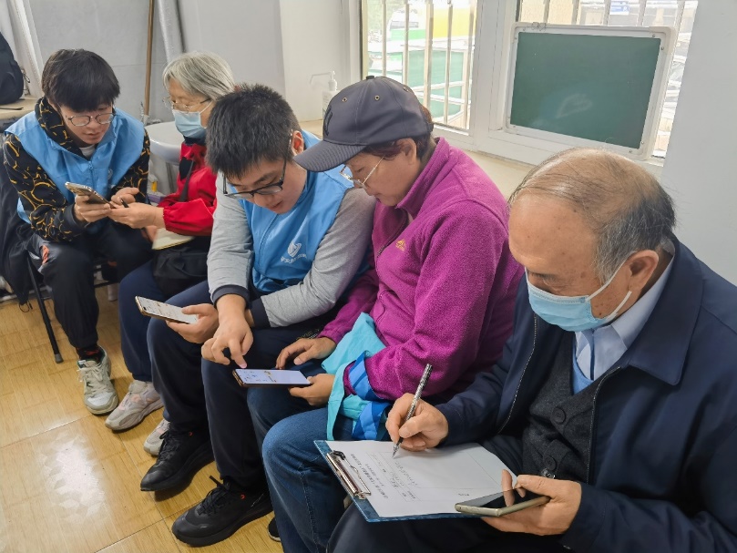 在黄庄社区志愿服务室,电子系志愿者为社区老年居民提供了智能手机使用教学,耐心细致地指导老年居民使用智能手机进行日常通讯、上网浏览信息以及使用各种应用程序。
