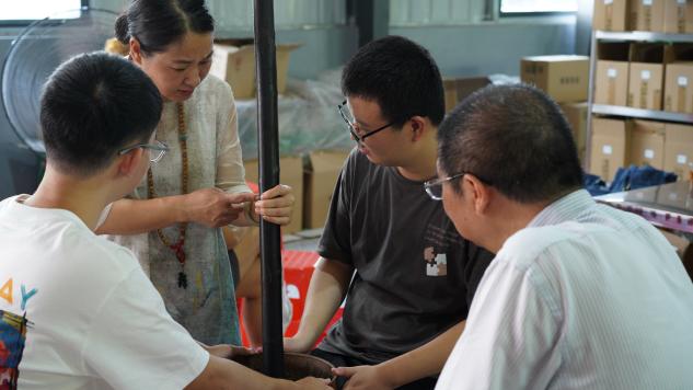 在梅城镇连心岭擂茶基地,同学们亲身体验非遗项目“梅城擂茶”的制作技艺,感受劳动乐趣与非遗文化魅力。安化一中李岱奕同学向支队成员介绍了擂茶文化如何融入当地婚礼、迎客、日常饮食等生活场景。来自广东的开云同学陈卓感慨:“擂茶不仅是一种技艺,更是一种承载当地文化与情感的纽带。”传递擂钵、共制擂茶,迅速拉近了两校学生的距离。
