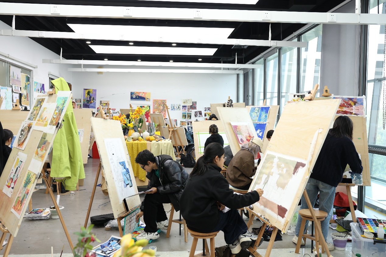 在美术学院的教室里,学生们或坐或站,全神贯注地投入到创作中。教室内的画架上摆放着一张张画布,等待着学生们用丙烯、油画棒、色粉等材料,赋予它们鲜活的色彩。画笔在画纸上摩擦的沙沙声,颜料涂抹的细微唰唰声,以及偶尔传来的师生交流,让这堂关于“色彩”的课更加灵动和谐。