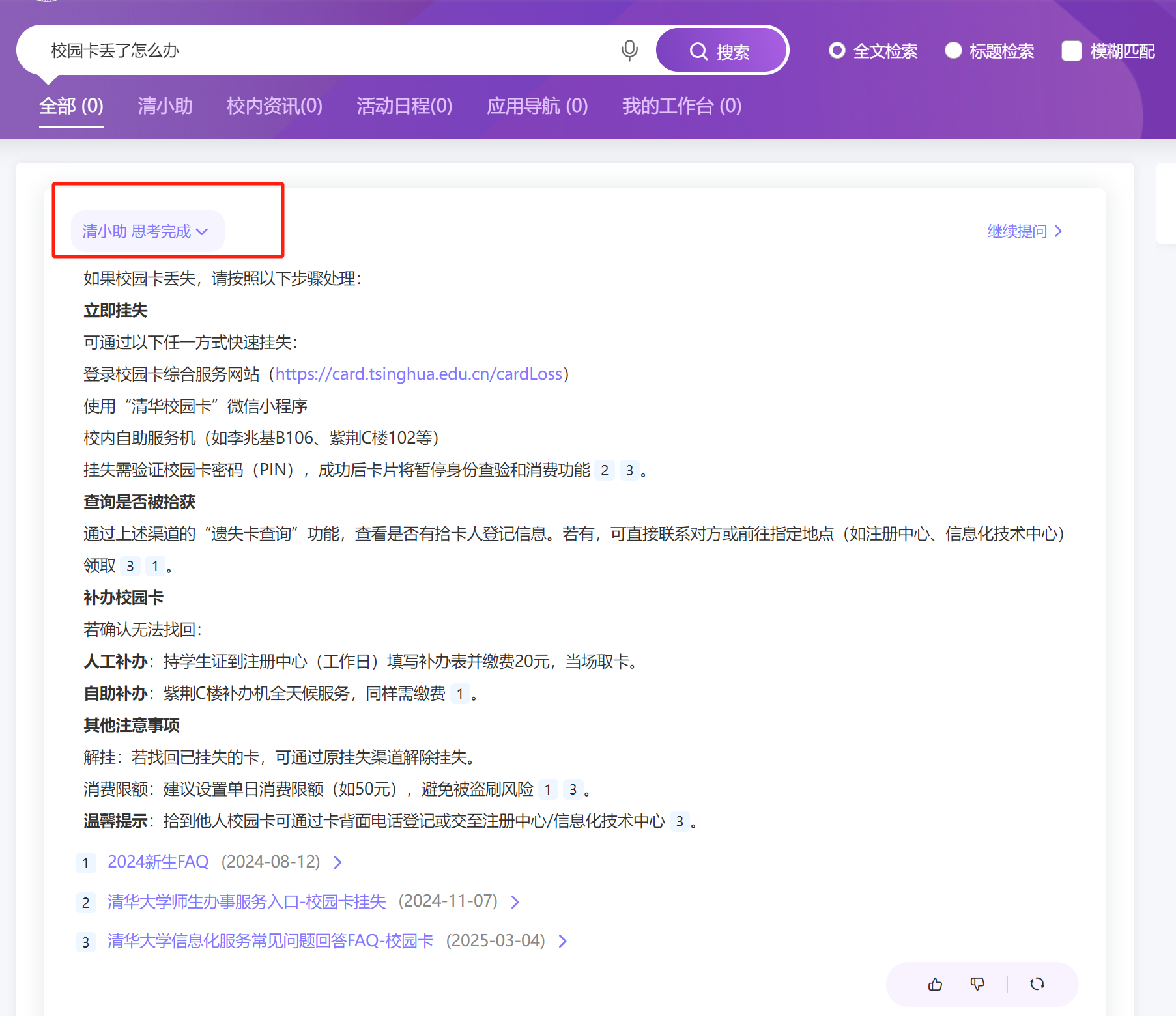 如果还需要进一步解答,只需要点击“继续提问”就可以和“清小助”持续互动。截至5月上旬,师生使用“清小助”累计提问3.8万余条,问答准确率达到90%以上。