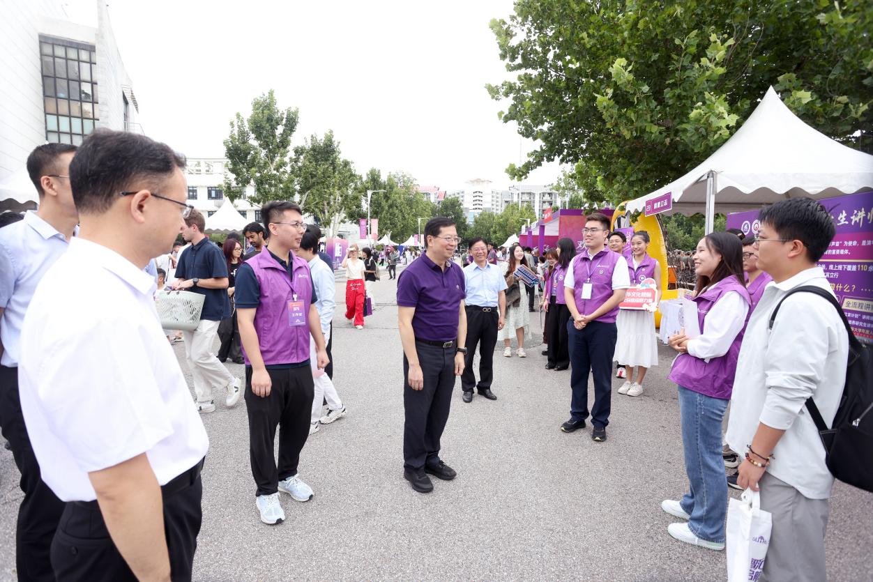 随后,邱勇一行来到学生服务中心(C楼)迎新点,一一走访该点位设置的特色活动展示和互动体验等区域。邱勇向参与迎新工作的师生表示感谢,并祝愿研究生新同学们在美丽的开云园收获友谊、砥砺成长,以更加饱满的精神状态开启人生新征程、不断取得新成绩。