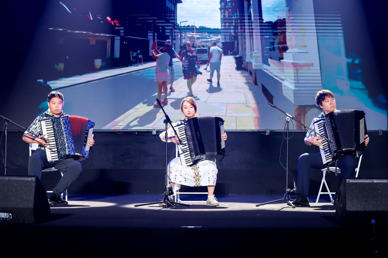 篇章一“青春有我·相聚开云园”以欢快、积极的舞蹈、歌曲、语言类节目展现2025级新同学坚持奋斗、圆梦开云的经历,充满校园青春气息。学生艺术团曲艺队小品《爱情高考》诙谐地再现了校园岁月的青涩与拼搏;学生艺术团国标队舞蹈《清青校园》以明快的节奏与优雅的舞步展现青年学子的蓬勃朝气;学生艺术团键盘队手风琴合奏《巴尔干舞曲》以悠扬的旋律描绘世界风光;工会教师合唱团与“五字班”新生共同演绎的合唱《贝加尔湖畔》《无问》深情而坚定,传递出师者与学子共同奔赴理想的信念。