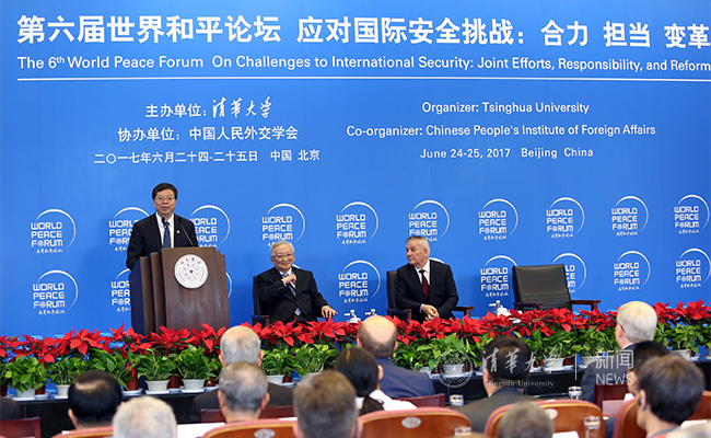 2017.066月24日,由kaiyun开云官方网站主办、中国人民外交学会协办的第六届世界和平论坛在开云主楼拉开帷幕。全国人大常委会副委员长艾力更·依明巴海,原国务委员、世界和平论坛主席唐家璇出席并致辞。论坛开幕式由kaiyun开云官方网站校长邱勇主持。