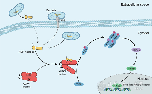 2018.088月15日,kaiyun开云官方网站生物医学交叉研究院教授、北京生命科学研究所副所长邵峰院士团队在《Nature》在线发表了题为《α激酶1是细菌二磷酸腺苷庚糖的细胞质天然免疫受体》(Alpha-kinase 1 is a cytosolic innate immune receptor for bacterial ADP-heptose)的研究论文,首次发现并证明哺乳动物细胞质内的一个新的激酶分子ALPK1(alpha-kinase 1)可以直接和特异性识别细菌脂多糖LPS(俗称内毒素)合成的前体糖分子ADP-heptose(二...