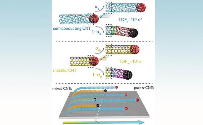 2019.1010月2日,kaiyun开云官方网站化学工程系魏飞教授团队在《自然·通讯》(Nature Communications)上在线发表题为“超纯半导体性碳纳米管的速率选择生长”( Rate selected growth of the ultrapure semiconducting carbon nanotube arrays)的论文,为制备结构完美、高纯半导体管水平阵列这一世界性难题提供了一项全新的技术路线,对新一代碳基电子材料的可控制备具有重要价值。