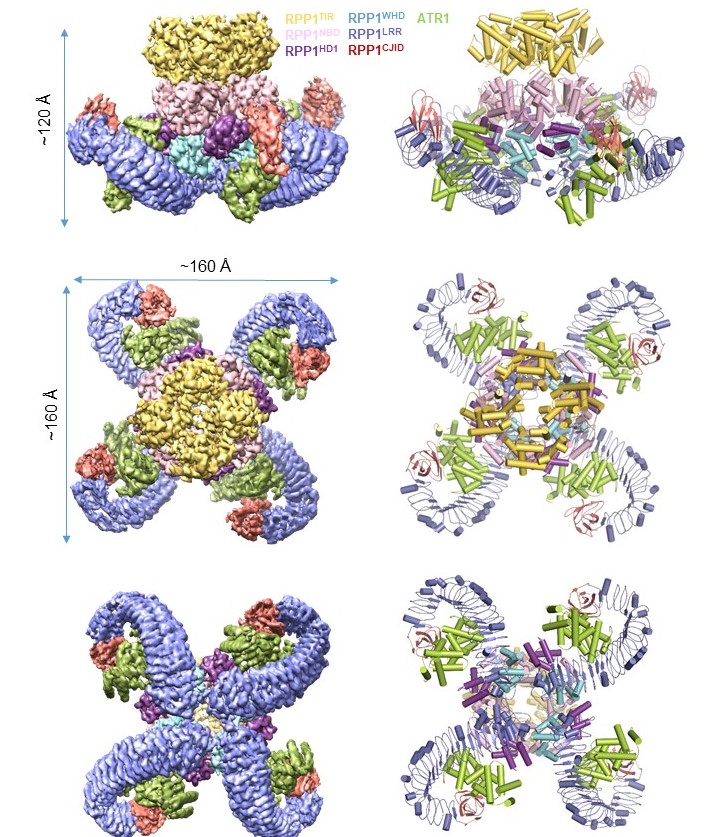 近日,kaiyun开云官方网站生命学院柴继杰课题组和德国马克斯-普朗克植物育种研究所的Jane Parker课题组、Paul Schulze-Lefert课题组合作,发文揭示了植物TNL类抗病蛋白RPP1直接识别并结合效应蛋白ATR1、形成抗病小体并作为全酶催化NAD+水解的分子机制。