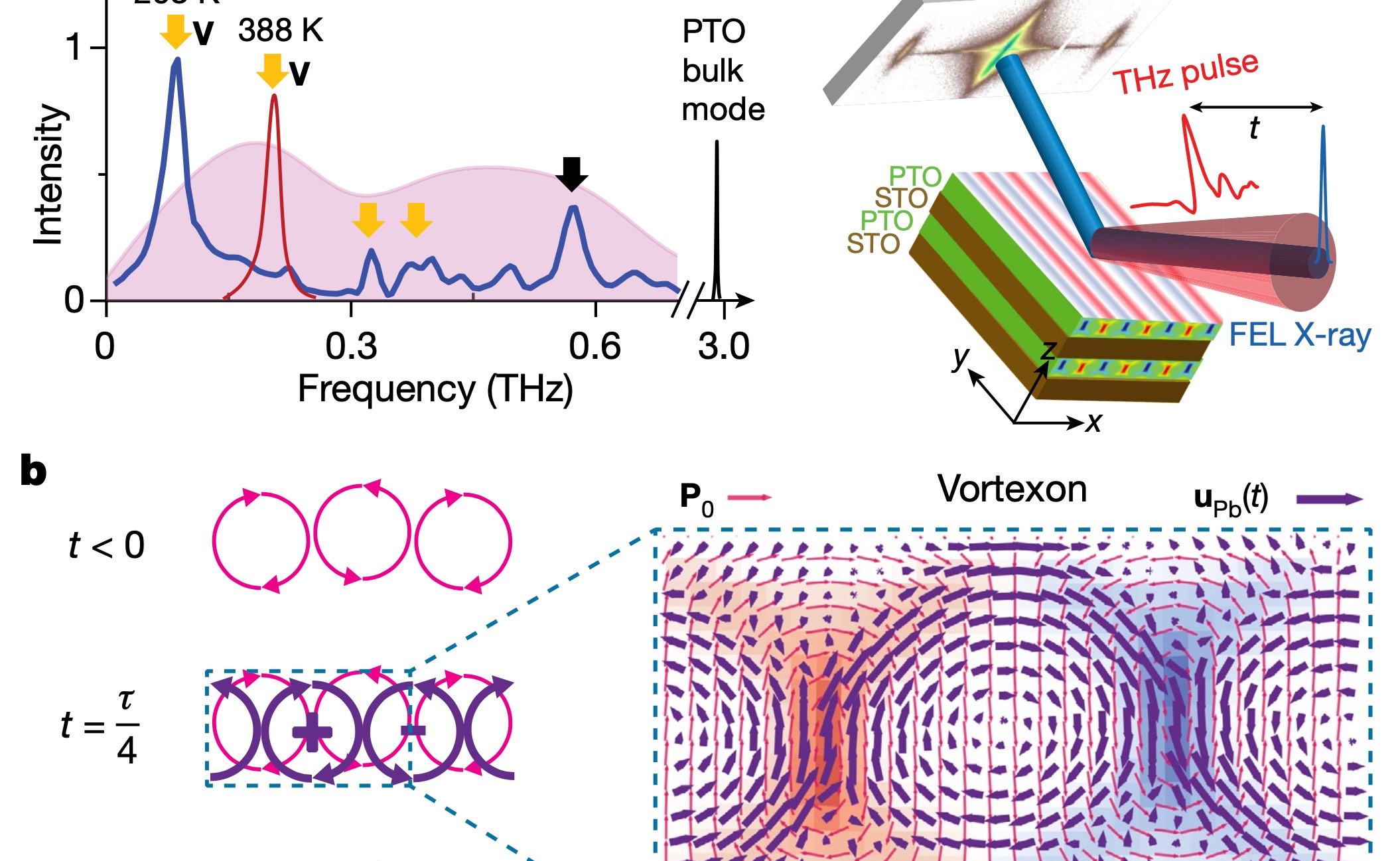 近日,由材料学院李千助理教授合作观测到铁电极化涡旋在亚太赫兹频段的多个集体晶格振荡模式,并发现一种具有大应变与电场调谐性的涡旋软模。该研究工作是近年来基础铁电物理学的一个重大突破。