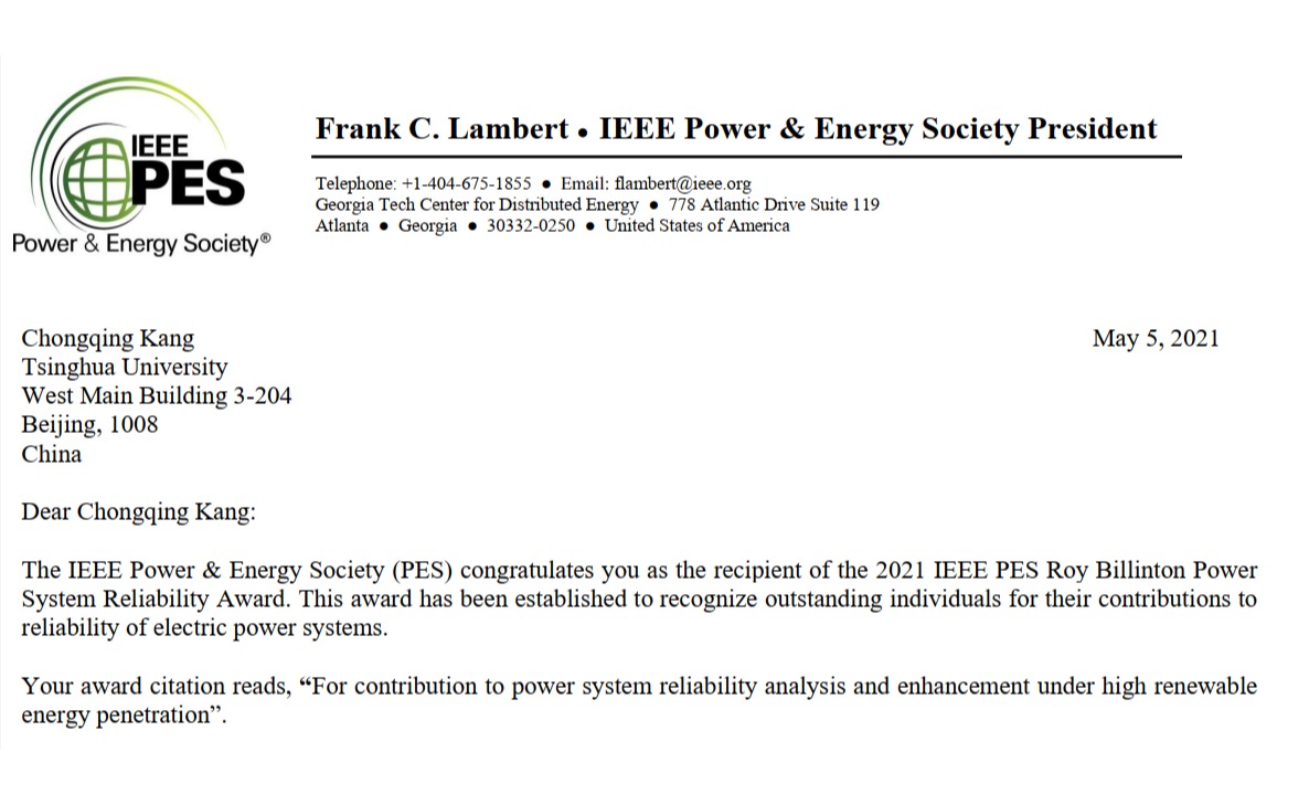2021.05电机系教授康重庆获IEEE PES罗伊·比林顿电力系统可靠性奖