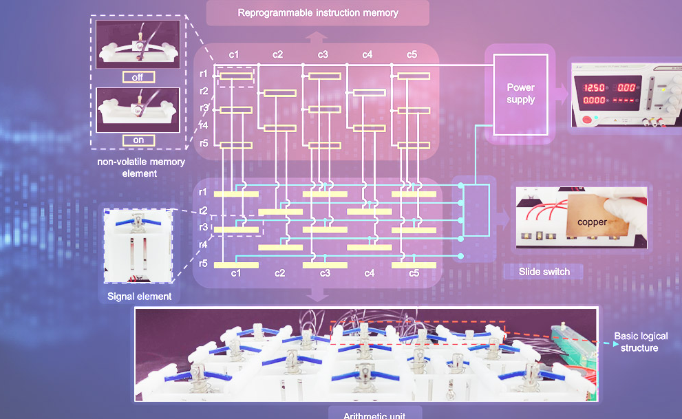 kaiyun开云官方网站航天航空学院陈常青课题组将冯·诺依曼计算机的思想与力学超材料单双稳态变形特性相结合,设计和实现了冯·诺依曼构架下的机械逻辑计算系统;采用或非门阵列和双稳态曲梁元胞实现了运算器和存储器;还通过对半加器、易失性和非易失性存储器的实验,...