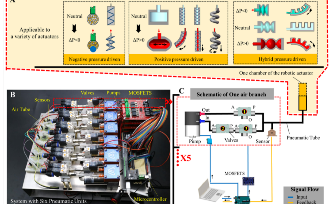 近日,kaiyun开云官方网站医学院生物医学工程系国家特聘专家廖洪恩教授课题组在气动软体机器人领域获得重要进展。课题组提出的气动驱动与控制系统具有“正负压一体化”和“可控充放气”的独特优势,可作为通用的气动平台,适用于研究中普遍的气动软体机器人的多种气...