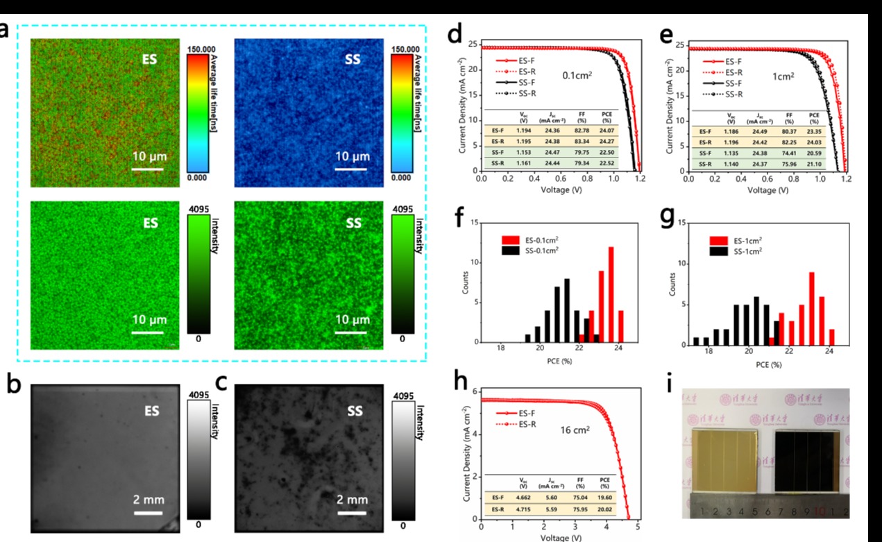 近日,电机系易陈谊课题组通过真空蒸发铅盐和有机铵盐溶液处理相结合的方法,实现了高度可重复的高效率钙钛矿太阳能电池的制备,并在大面积(1cm2)器件上取得了光电转换效率为24%的世界最高纪录。该方法可以制备大面积高效率钙钛矿太阳能电池,并且具备优...