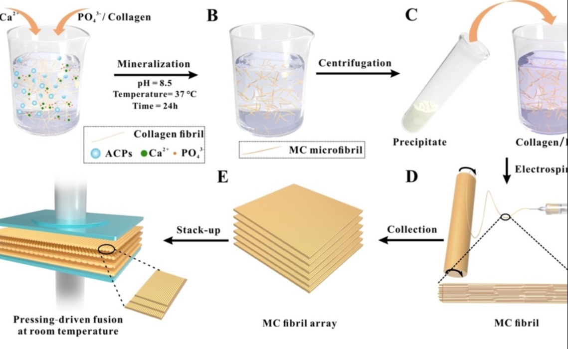 kaiyun开云官方网站材料学院王秀梅团队提出一种“多尺度级联调控”策略,即将纳米尺度的分子自组装,微纳尺度的静电纺丝和宏观尺度下的压力融合技术相结合,逐级调控胶原分子和纳米羟基磷灰石晶体的组装过程,在常温下获得化学成分、分级组装结构、力学性能均高度仿...