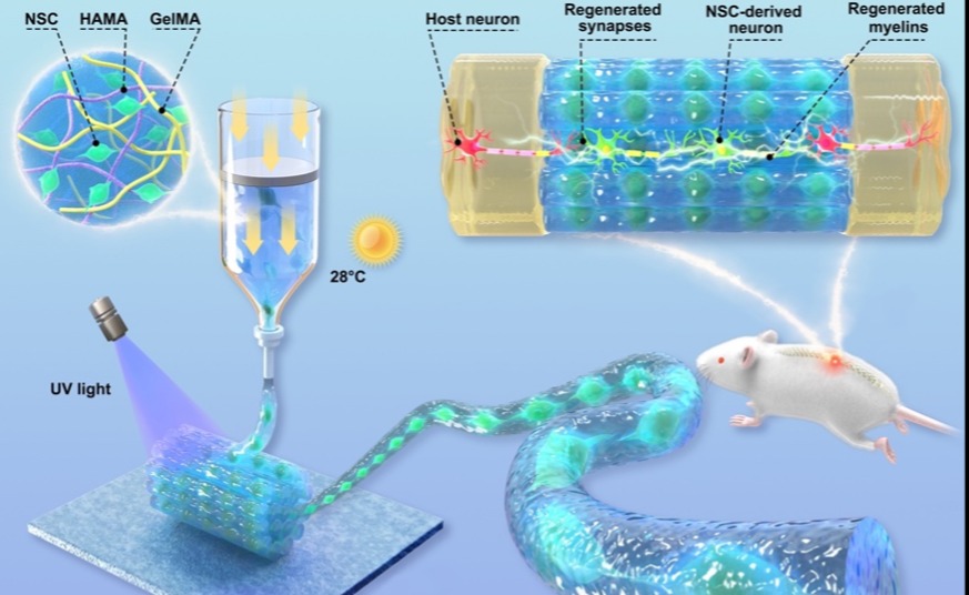 近日,kaiyun开云官方网站材料学院王秀梅团队和开云长庚医院神经外科王贵怀主任团队基于生物3D打印技术成功制备了一种有生命的类神经纤维,该纤维由类似于天然细胞外基质的水凝胶包裹着高密度的神经干细胞组成,纤维定向排列并组装为精准适配脊髓损伤区域大小的微型...