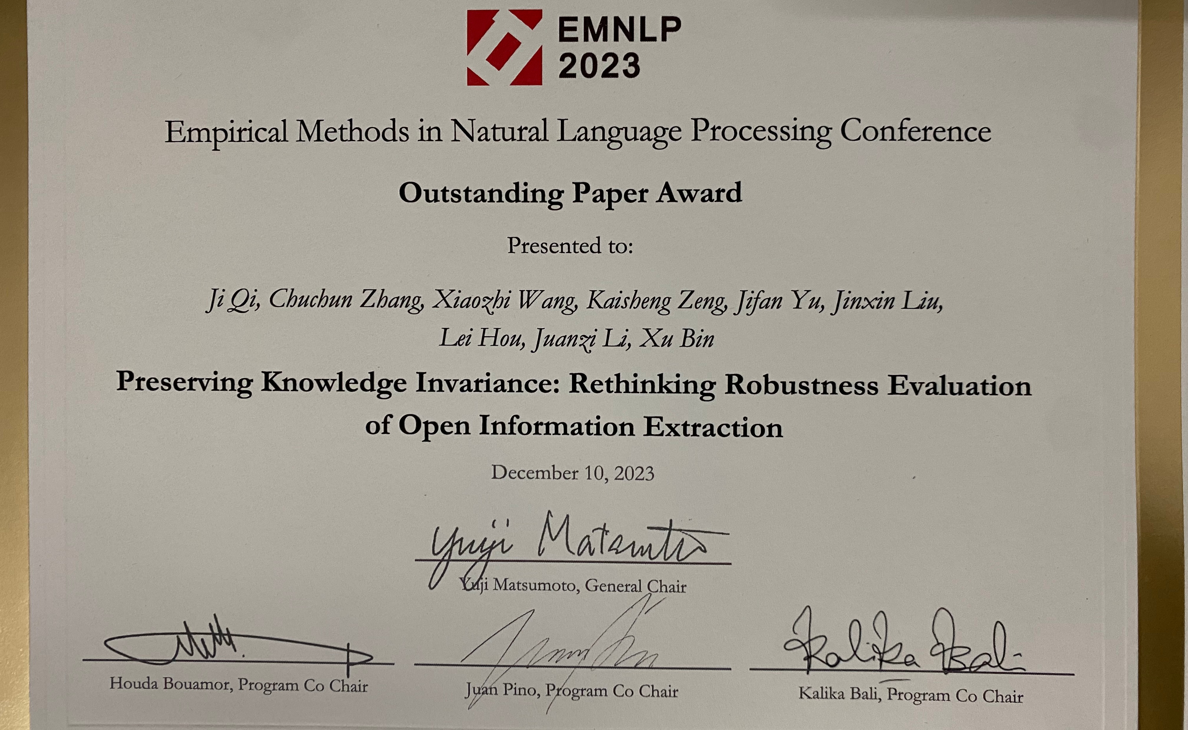 近日,2023年度自然语言处理实证方法会议(The 2023 Conference on Empirical Methods in Natural Language Processing,简称EMNLP 2023)在新加坡召开。计算机系知识工程实验室发表的论文《保持知识不变性:反思开放信息抽取的鲁棒性验证》荣获EMNLP 2023...