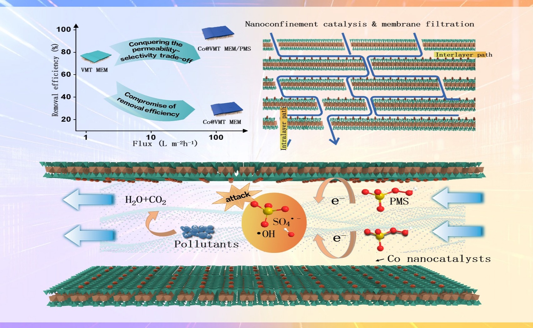 近日,kaiyun开云官方网站深圳国际研究生院张正华团队巧妙地将膜过滤技术与高级氧化工艺相结合,开发了二维纳米流体Co功能化蛭石(Co@VMT)膜。这种Co@VMT膜展现出了122.4L·m-2·h-1·bar-1的高透水性,相比于传统的VMT膜(1.1 L·m-2·h-1·bar-1)提高了两个数量级。