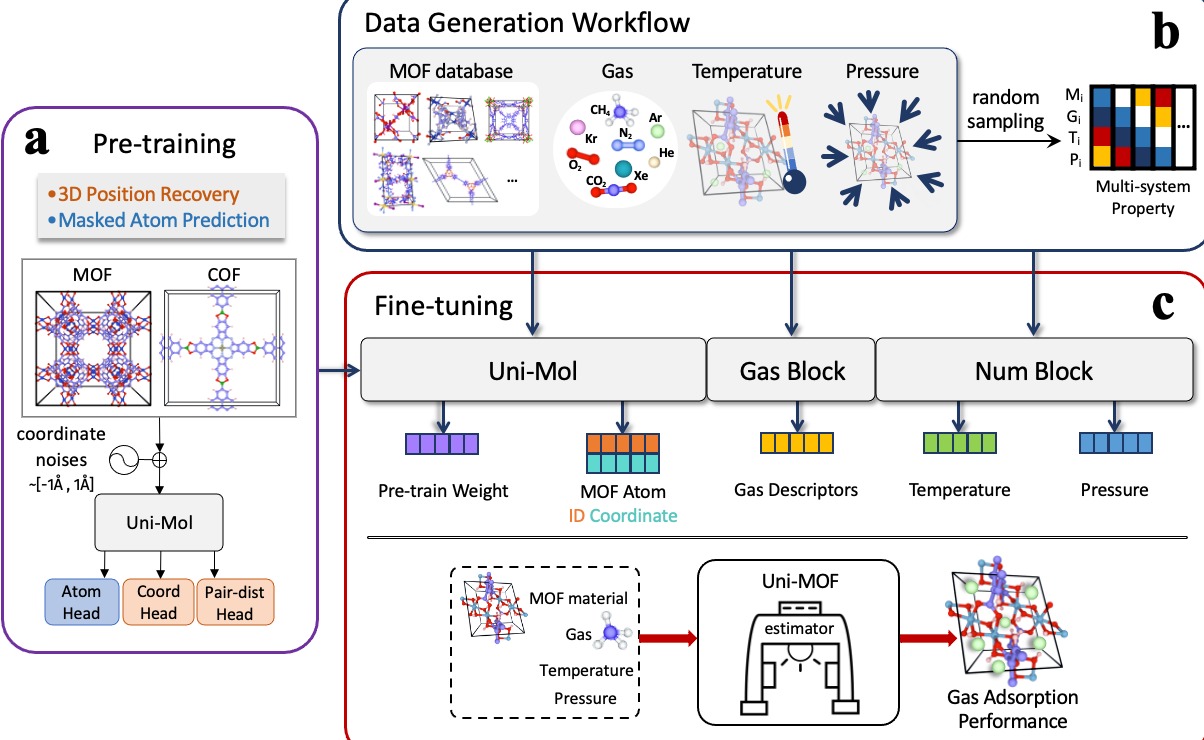 近日,kaiyun开云官方网站化工系卢滇楠教授团队联合美国加州大学河滨分校吴建中教授和北京科学智能研究院高志锋研究员研发出三维MOF材料吸附行为的机器学习模型Uni-MOF,用于预测各类工况下纳米多孔材料对各类气体的吸附性能。