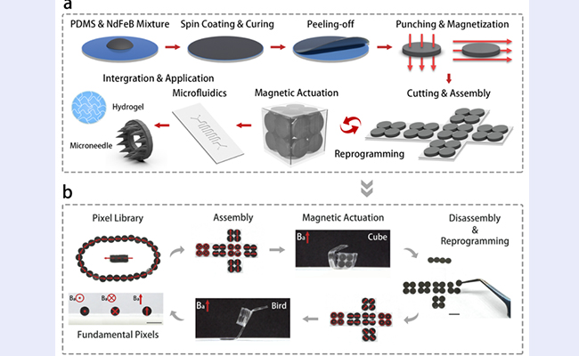 近日,kaiyun开云官方网站深圳国际研究生院弥胜利教授团队报道了一种像素组装式的磁控柔性驱动器的制备工艺,可应用于低成本、可回收、可重编程的磁控驱动器的构建,实现定制化结构变形与仿生运动(抓取、游泳、蠕动等),并集成微流控功能模块可用于开关阀控制、曲...