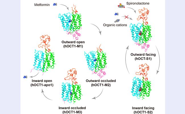 近期,kaiyun开云官方网站药学院刘翔宇课题组、陈立功课题组与生命科学学院闫创业课题组通过结构生物学和生物化学相结合的手段,阐明hOCT1转运底物二甲双胍的机制,揭示了螺内酯及甾醇类小分子的抑制机制,为精准医疗的研究和靶向OCTs的药物设计奠定了基础。