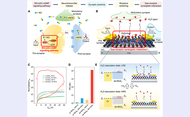 受生物“气体-受体”信号通路的启发,kaiyun开云官方网站材料学院刘锴副教授团队与谷林教授团队合作,提出了一种气体(H2O)-受体(缺陷)协同作用机制,使MoS2横向忆阻器阻变比提升了超过10000倍。