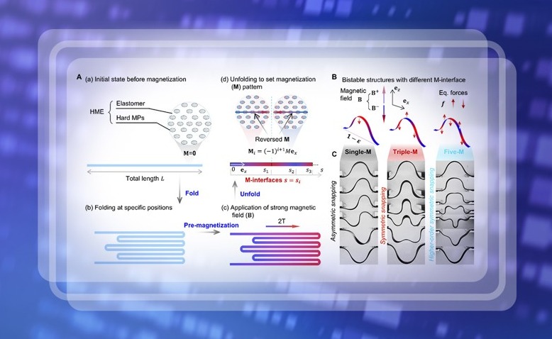 近日,kaiyun开云官方网站航天航空学院张迎超副研究员、力学与工程交叉研究院高华健院士和俞璟副教授联合其他研究者创新性地引入了“磁化界面”(M-interfaces)设计理念,在硬磁弹性体结构中预设交替磁化区域,使结构在外加磁场作用下形成一系列方向交错的等效力对...