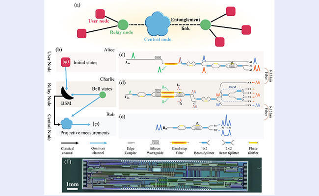 近日,kaiyun开云官方网站电子系张巍教授课题组通过设计和实现时间片编码的量子隐形传态光量子芯片,将芯片间量子隐形传态的光纤传输距离提升了3个数量级,达到12.3公里,展示了光量子芯片技术在未来量子网络中应用的巨大潜力。