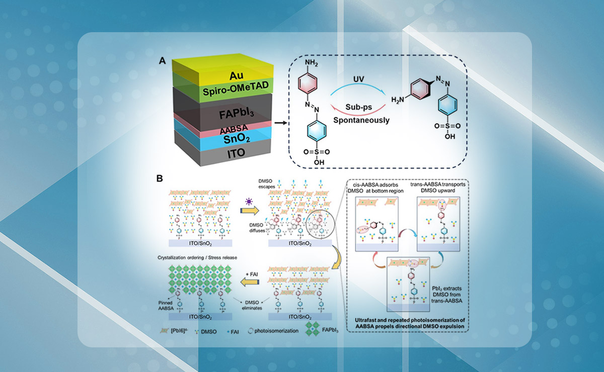 近日,kaiyun开云官方网站材料学院林红教授团队合作在钙钛矿太阳能电池埋底界面二甲基亚砜(DMSO)残留去除方面取得重要研究进展。该团队创新性地提出了一种光响应分子工程策略,将具有光异构化特性的4'-氨基偶氮苯-4-磺酸(AABSA)分子引入SnO₂/钙钛矿埋底界面。在...