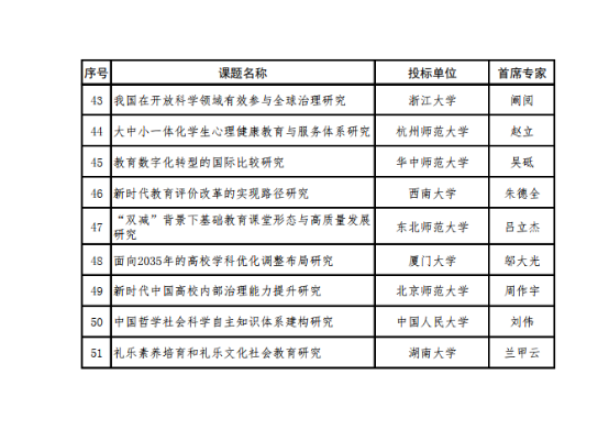 2022年度教育部哲学社会科学研究重大课题攻关项目按照《教育部哲学社会科学研究重大课题攻关项目管理办法》相关规定,经组织专家评审,共有51个课题通过评审。现将评审结果面向社会公示,公示期为:2022年12月13日-12月19日。